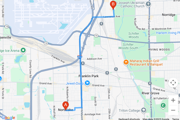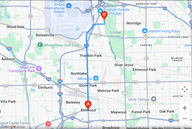 The distance from Maywood, IL to Axeclusive Axe Throwing & VR Lounge is approximately 6.8 miles.The drive typically takes about 24 minutes via South 9th Avenue and Des Plaines River Road/North River Road
