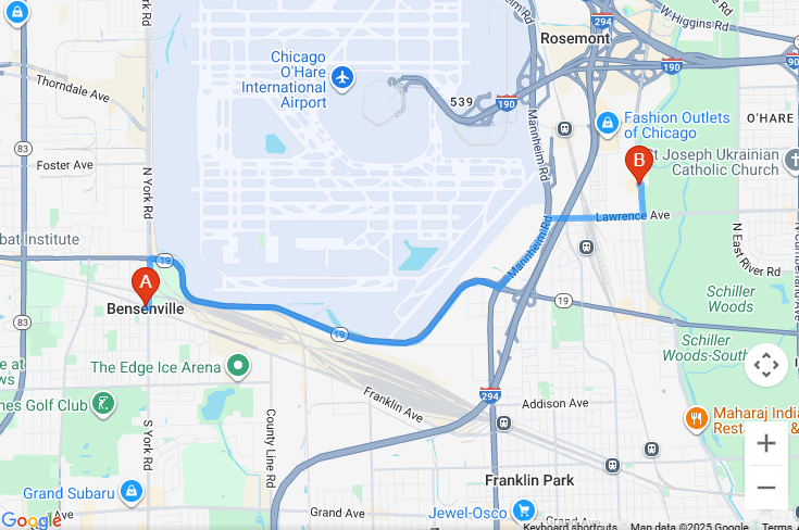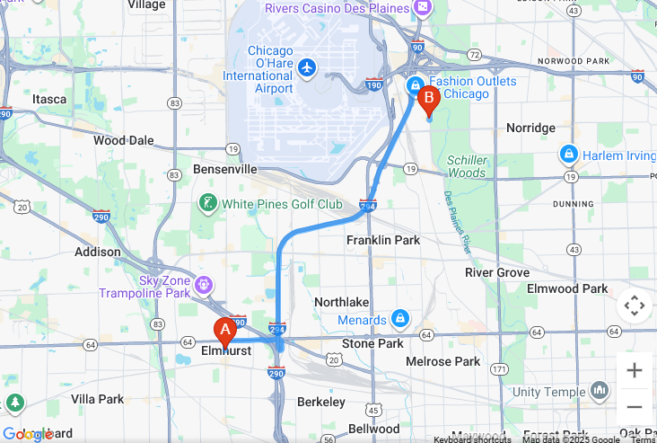 The distance between Ohare Airport, IL and Axeclusive Axe Throwing VR Lounge Schiller Park IL is 4 miles along I-190 E according to Google Maps. It should take about 11 minutes to get there by car.